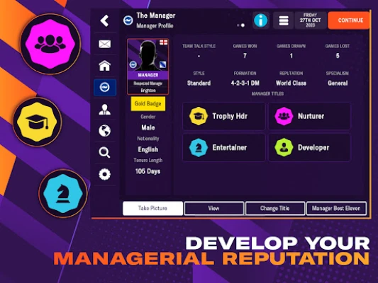 Earn reputation titles as you progress through your career based on your tactical approach, personality and transfer decisions. If you've got a reputation for developing young talent, your club may be the ideal destination for an in-demand wonderkid.
