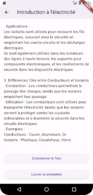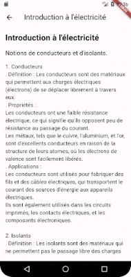 Cette application permet de revoir les bases de l'électricité ou bien d'apprendre l'électricité. Cette application mobile est constituée de plusieurs cours. Avec pour chaque cours une simulation et un quiz de 4/5 questions. Les cours traitent de l'introduction à l'électricité avec la compréhension de la charge (tension, puissance) en fonction du courant et de la résistance.