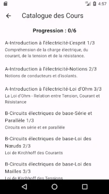 La notion de conducteurs et d'isolants et enfin la loi d'ohm (relation entre la tension, le courant et la résistance). Les circuits électriques de bases série/parallèle, loi des nœuds, loi des mailles. Cette application permet de délivrer un certificat de réussite des cours au format PDF avec le Prénom et Nom de l'apprenant. Cette certification n'a aucune valeur, c'est juste pour motiver l'apprenant.