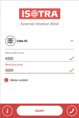 By selecting type of blind, width and height of a window, the application will calculate the packet height which will cover part of the window view-space but will also provide you an under-plaster option. Furthermore the application will calculate number of blind brackets, guiding rails and bearings placing. Smart tool for the office-use as well as for construction site.